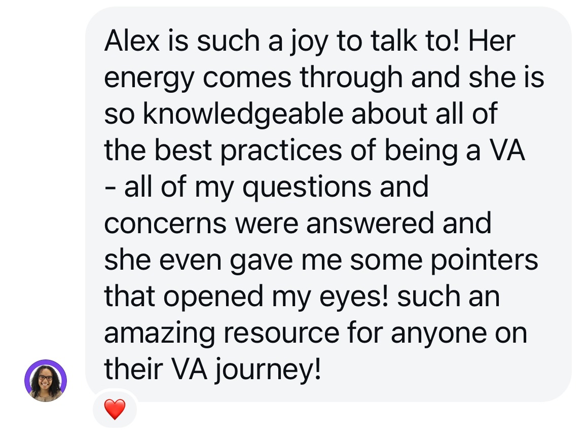Business Growth Roadmap: Walk away with a clear, actionable plan for scaling your VA business sustainably and healthily. I will help you identify opportunities for growth and provide you with the tools to make it happen without burning out in the process.